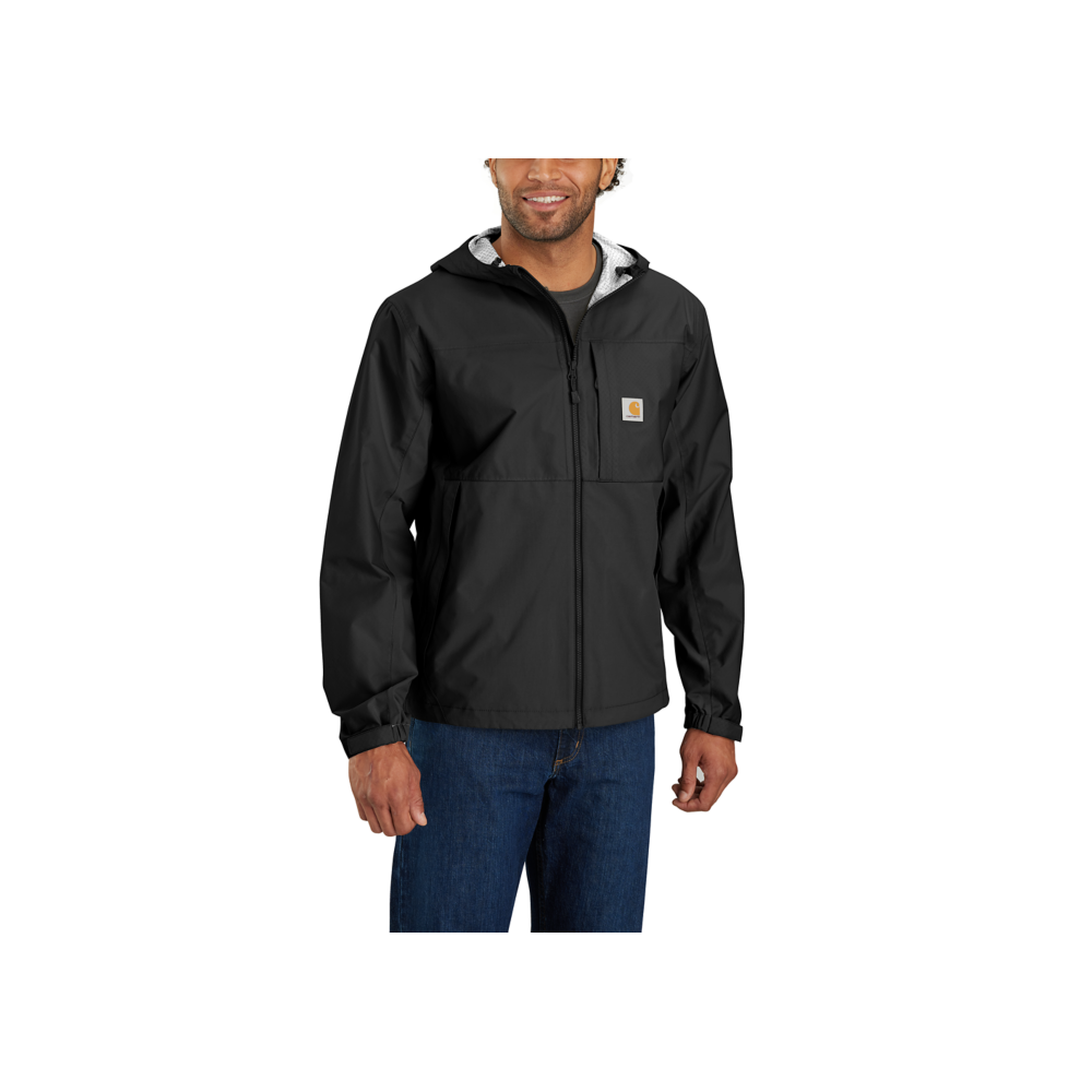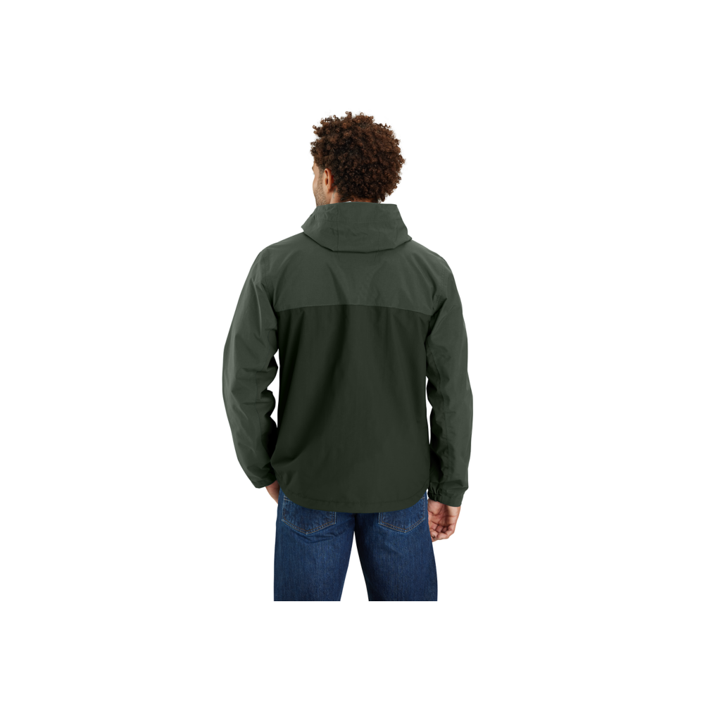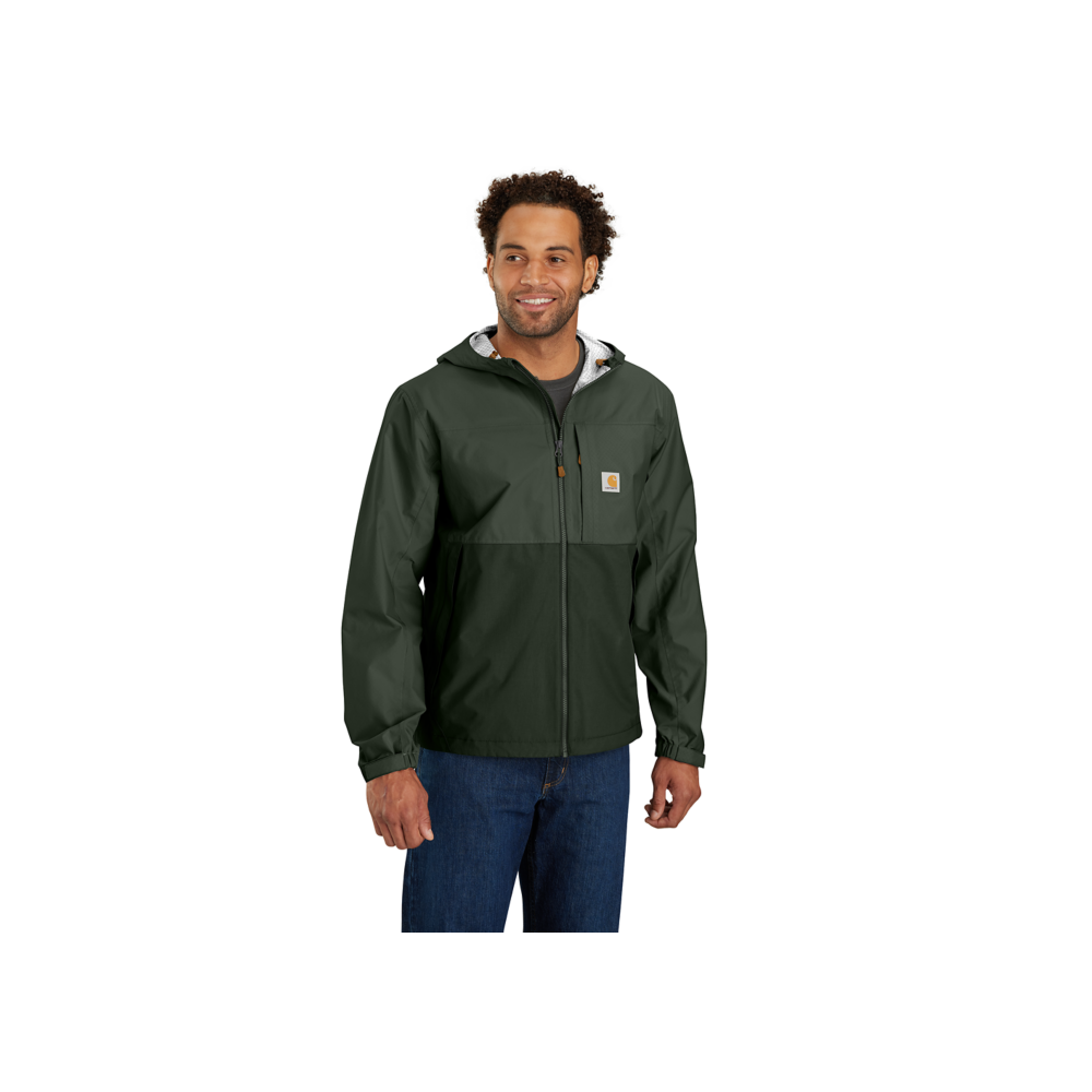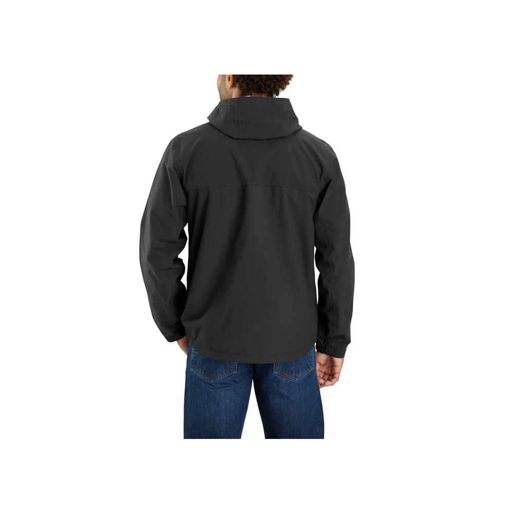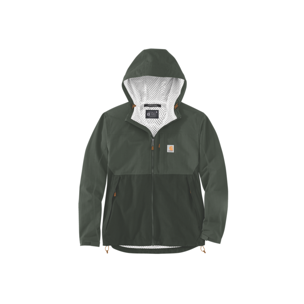 Corte Relaxed Fit · Wind Fighter™ - Resistente al viento · Storm Defender™ - Membrana laminada impermeable y transpirable · Capucha de tres piezas unida con bajo ajustable y cordón oculto · Cuello tipo "mock neck" (alto, sin vuelta) · Manga larga · Bolsillo en el pecho con cierre de cremallera · Dos bolsillos frontales inferiores con cierre de cremallera · Se puede guardar dentro del bolsillo inferior izquierdo con cremallera · Bolsillo interior con cierre de gancho y bucle (tipo velcro) · Cremallera frontal de largo completo con protector para la barbilla · Puños parcialmente elásticos con cierre de gancho y bucle para un ajuste adicional · Bajo trasero extendido para mayor cobertura con cordón ajustable · Costuras completamente selladas e impermeables · Etiqueta Carhartt cosida en el bolsillo · Tejido de punto plano (Woven) · 4,2 oz/yd² - 143 g/m² · Nylon con tratamiento repelente al agua (DWR) · 100% Nylon