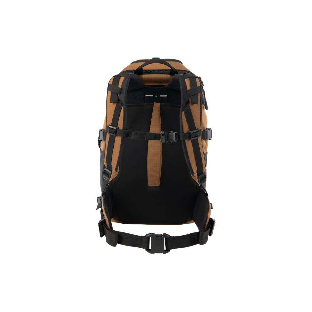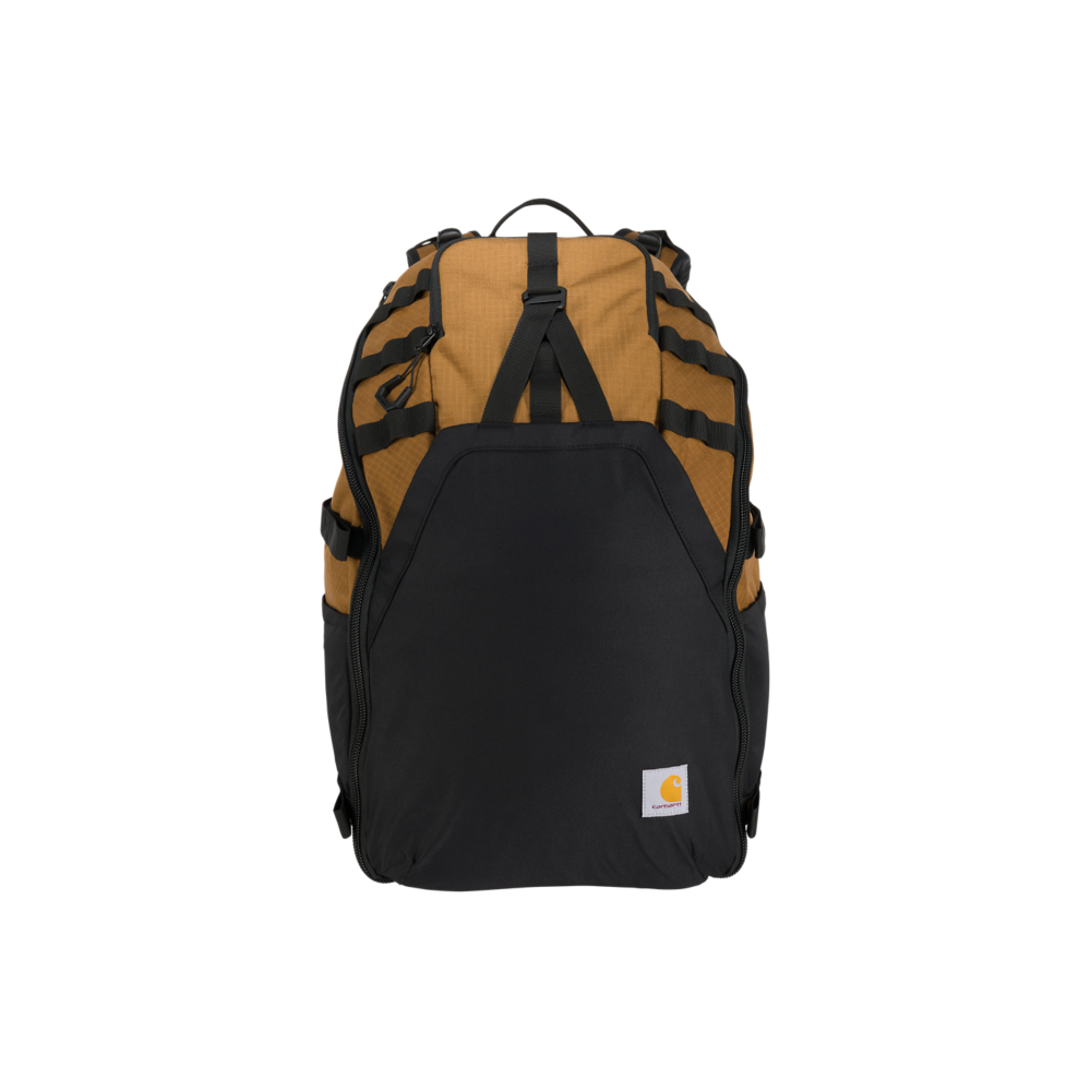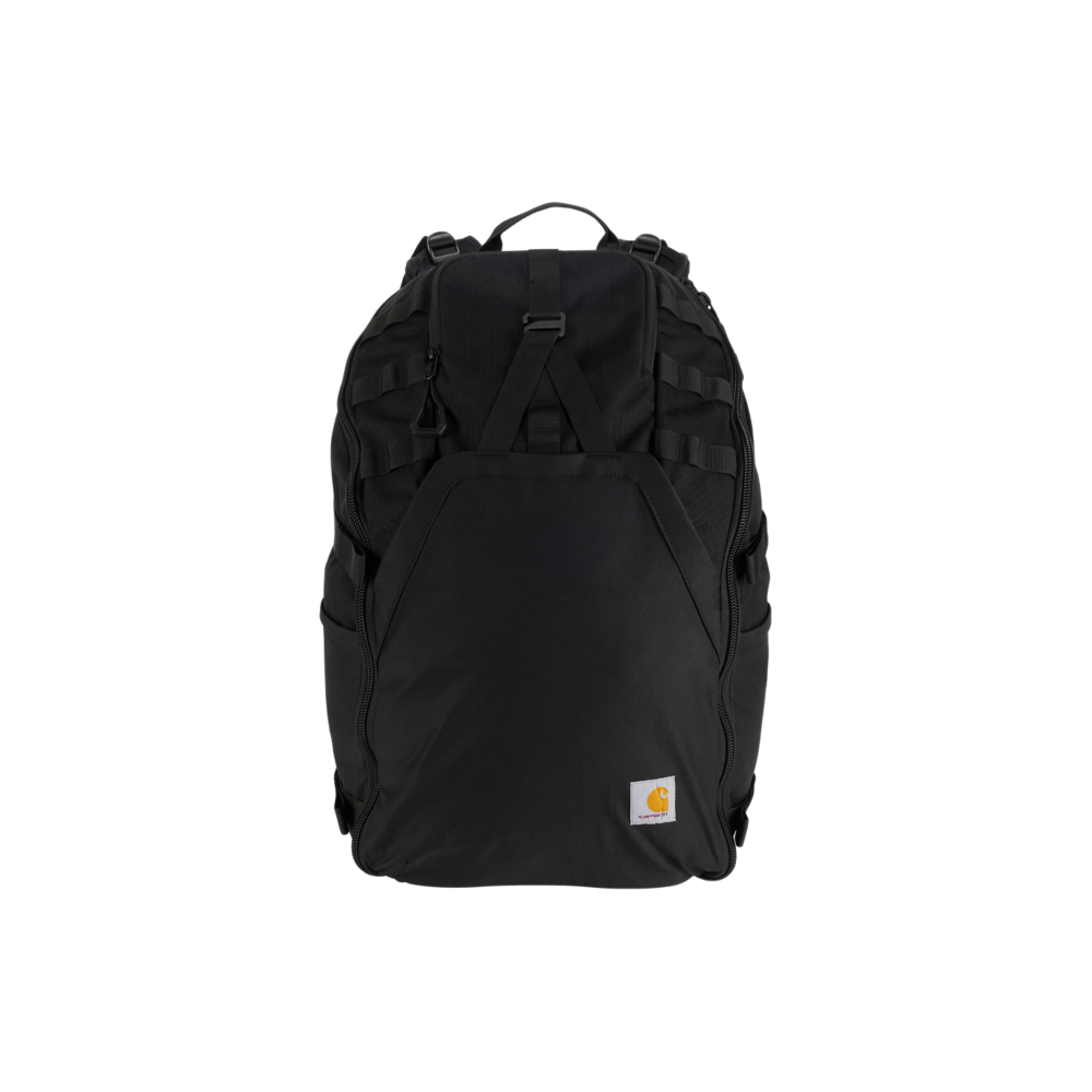 Rain Defender™ - Acabado repelente al agua duradero · Correas de compresión para asegurar la carga de senderismo · Amplio compartimento principal con funda dedicada para portátil de 15 pulgadas y funda para tablet · Apertura completa con cremallera · Cuatro bolsillos interiores de malla para organización interna · Dos grandes bolsillos exteriores elásticos de tejido · Panel trasero ajustable para adaptarse a diferentes alturas · Etiqueta Carhartt en la parte frontal · Tejido tejido · Nylon Cordura™ de 500 deniers · 100% Nylon Cordura®