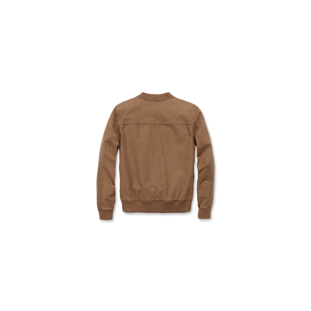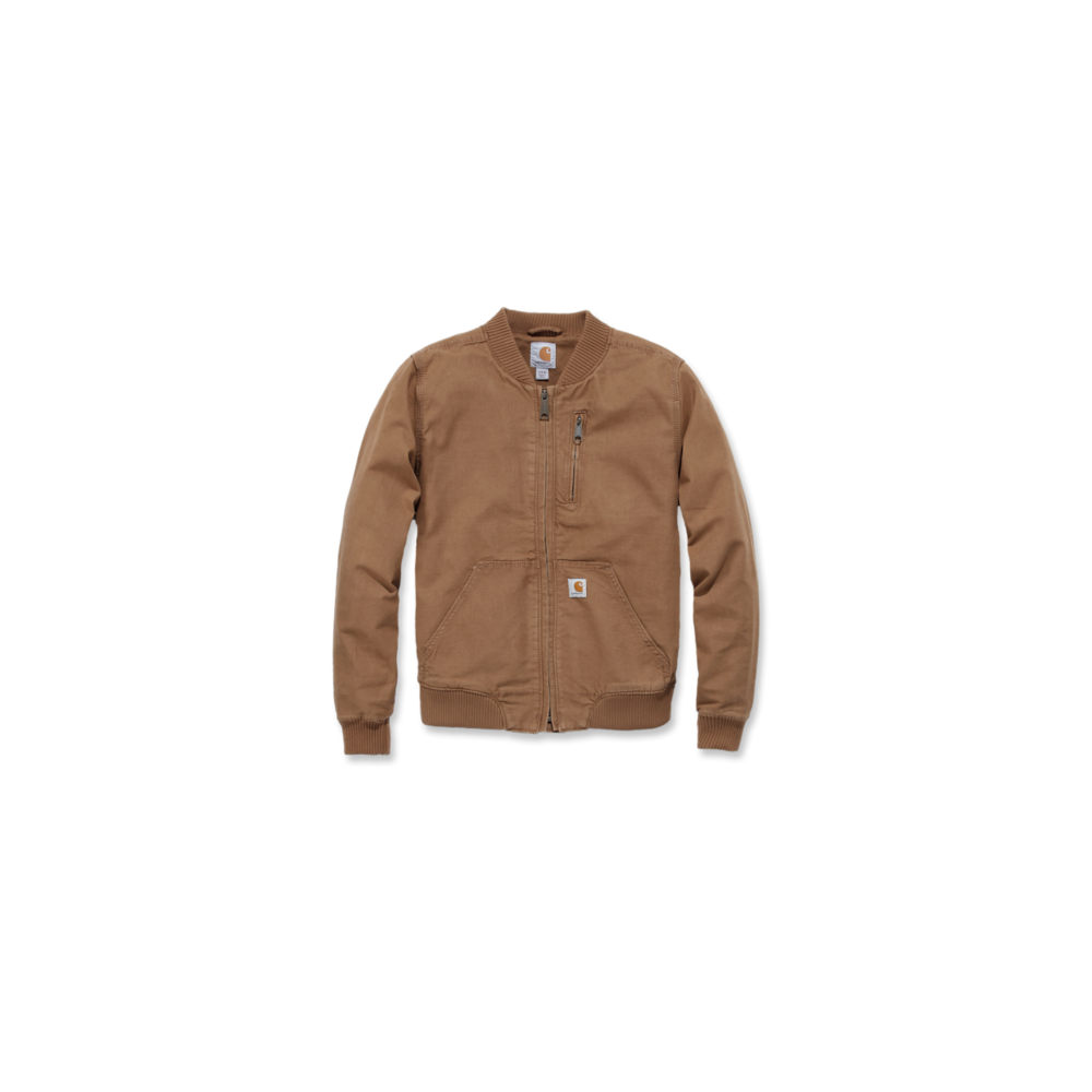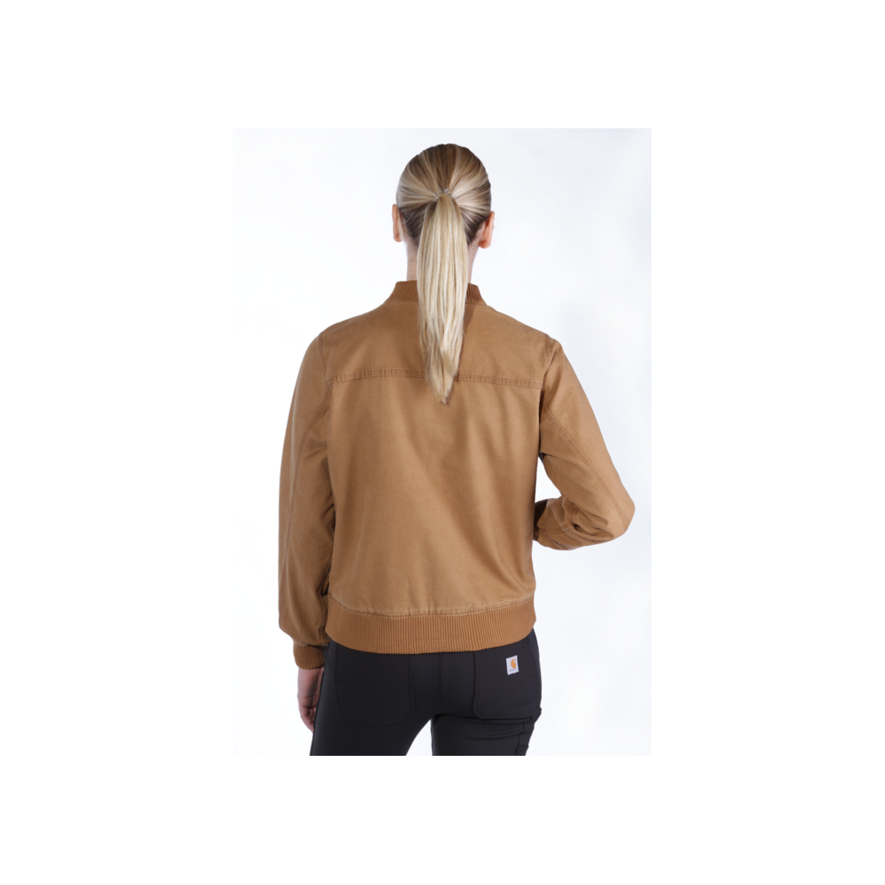 Una chaqueta bomber clásica pero al estilo Carhartt. Esta chaqueta para mujer está fabricada en lona forrada con malla, con la suficiente elasticidad para que puedas moverte fácilmente cuando trabajas. Tan funcional como cómoda, esta robusta chaqueta incluye dos bolsillos grandes en la parte frontal y un bolsillo pequeño con cremallera a la altura del pecho.